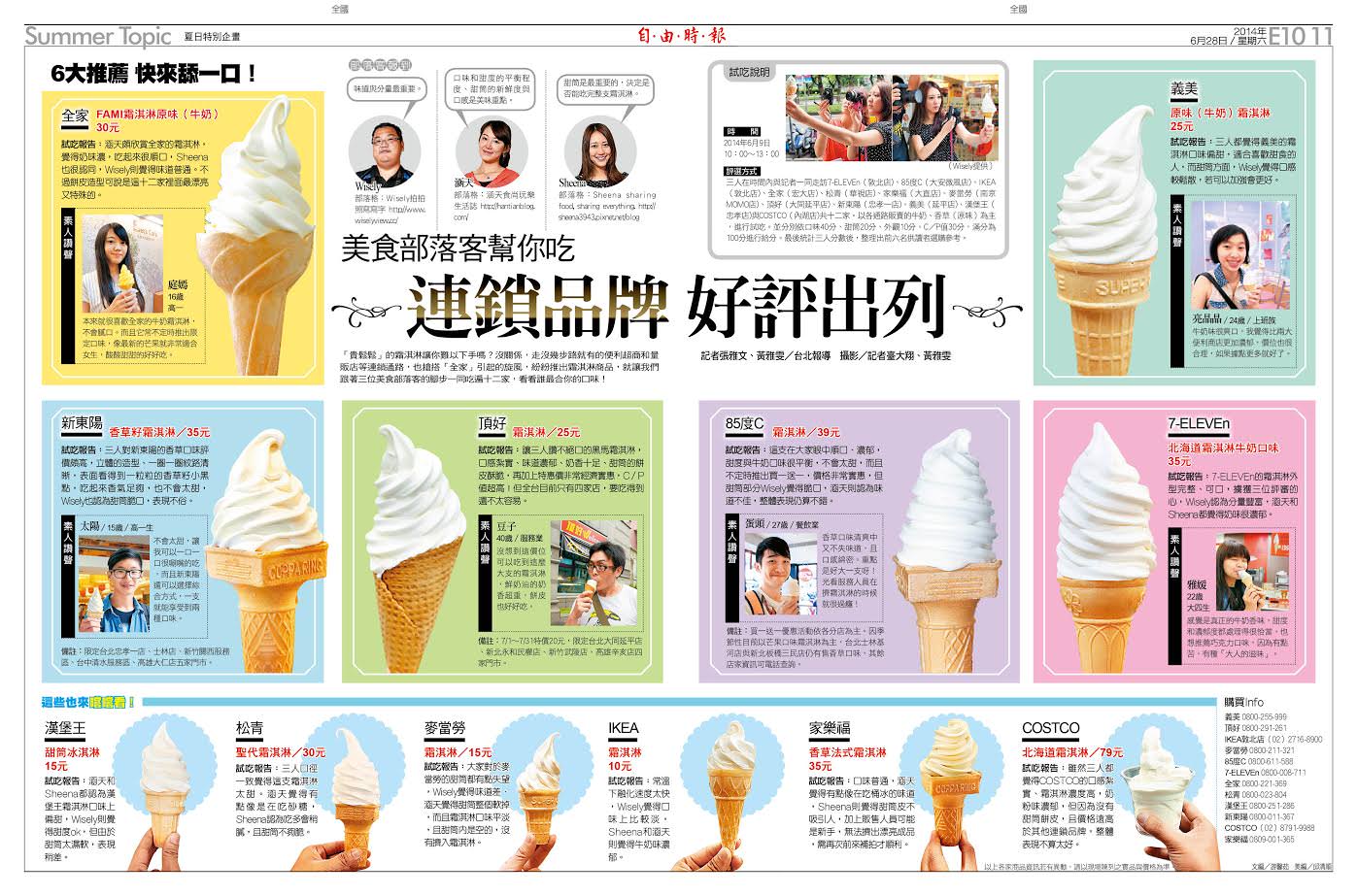 前陣子自由時報的記者朋友找Wisely幫忙,想要做一份周末特刊的『夏季霜淇淋』特輯(點我看大圖),要我再找兩位朋友一次試吃12家連鎖通路超市便利商店,而且要現場打分數且記錄心得。所以,後來約了正妹Sheena和小涵子一起去品嚐PK,而我們也真的一口氣將7-11.全家.漢堡王.麥當勞.義美.IKEA.松青.新東陽.85度C.家樂福.頂好.COSTCO全都吃遍~體重直線上升破錶!